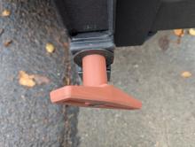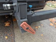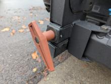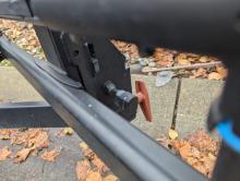 The RockyMounts BackStage is a fold-out bike rack for a car. When folded out, it provides access to the trunk or hatchback door. When folded in, the handle is used to screw and tighten the folding mechanism together.